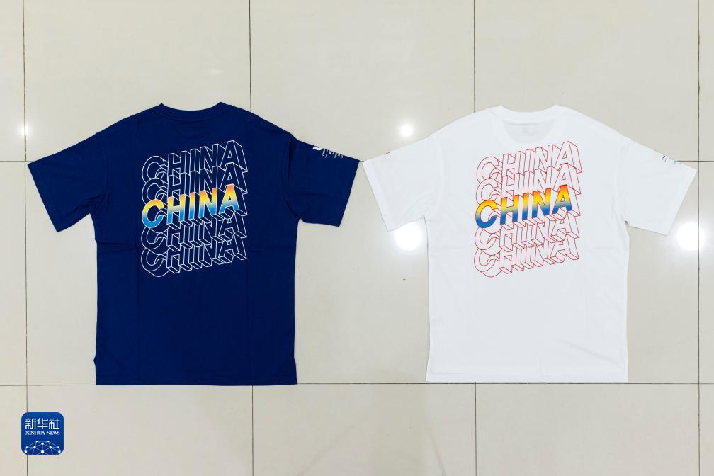 這是7月24日拍攝的第31屆世界大學生夏季運動會中國代表團成員配發裝備中的短T恤衫。