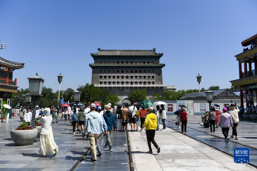 游客在正陽門箭樓前的前門大街參觀游覽(7月6日攝)。正陽門是中國明、清兩代王朝都城的正南門,坐落在老北京城的南北中軸線上,俗稱前門。1988年,正陽門城樓和箭樓被國務院批準列入第三批全國重點文物保護單位。