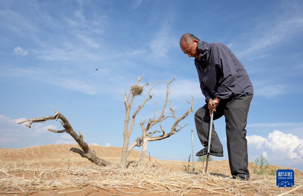 7月19日,中衛市西郊林場場長唐希明在栽種技術處理過的灌木苗,進行夏季雨季造林試驗。如果成功,可實現春、夏、秋三季造林。
