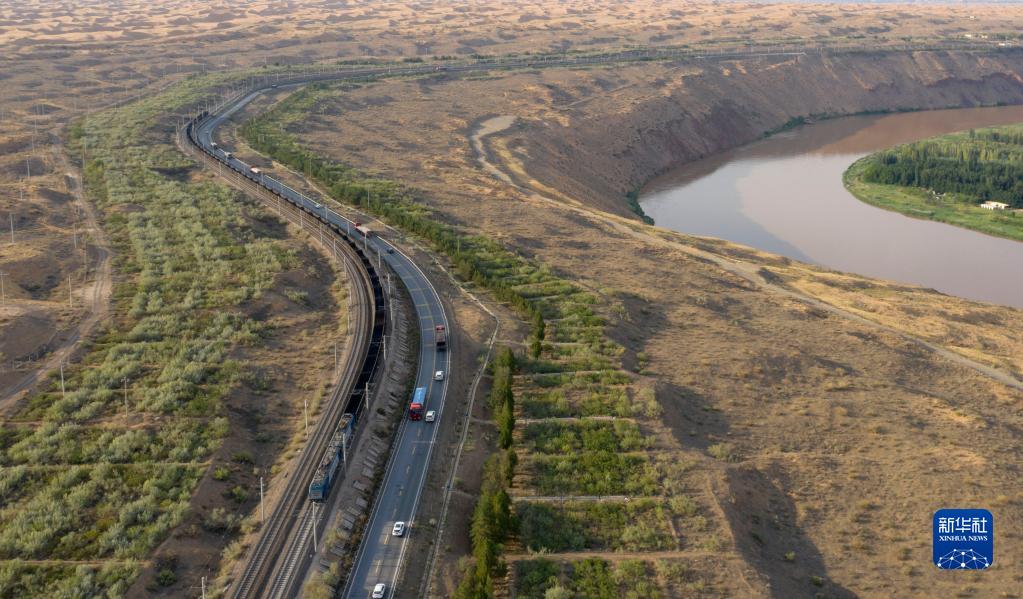 中國首條沙漠鐵路——包蘭鐵路兩側形成了綠色長廊(7月19日攝,無人機照片)。