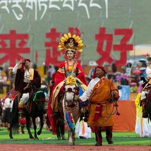 7月25日在玉樹賽馬場拍攝的文成公主進藏實景演出。