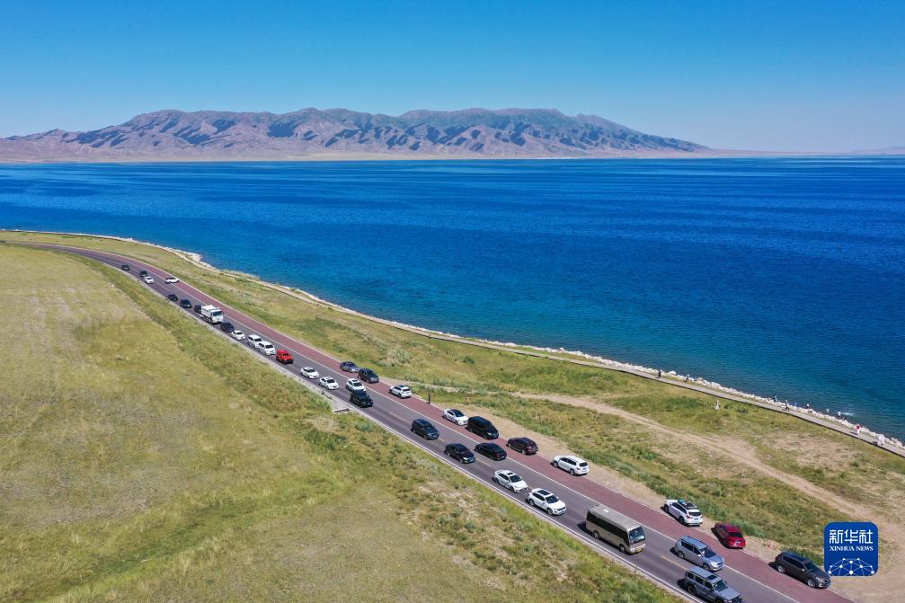 7月25日,車輛排隊進入新疆賽里木湖景區(無人機照片)。