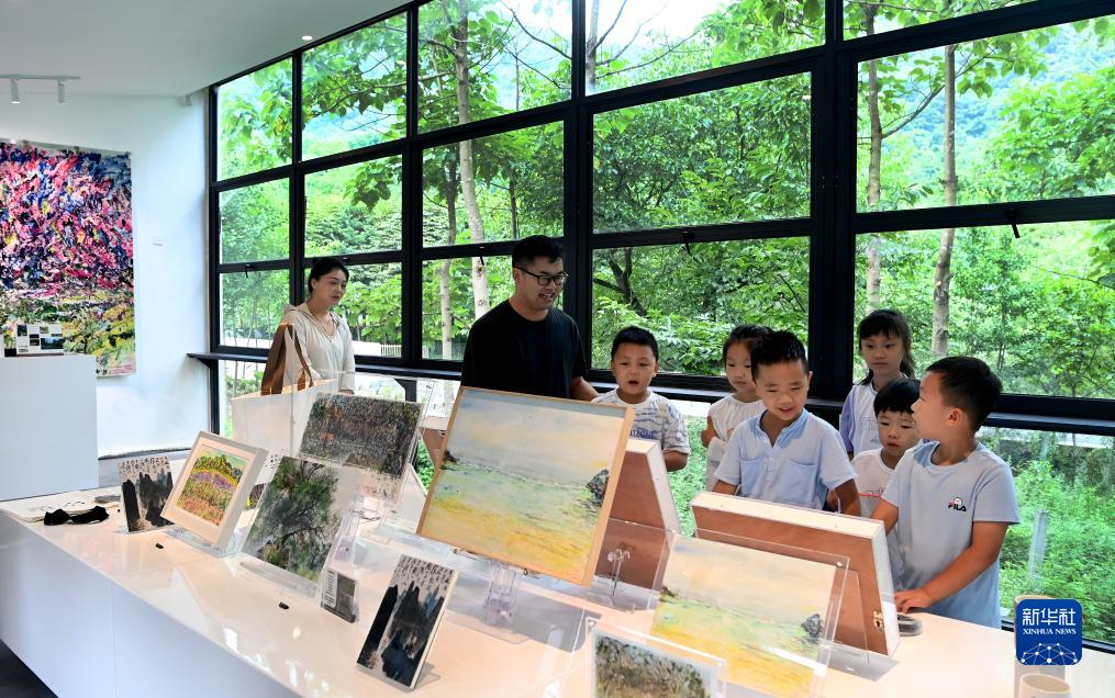 參加研學的小學員在陜西省漢中市留壩縣小留壩村樓房溝玉雙美術館內參觀(7月24日攝)。