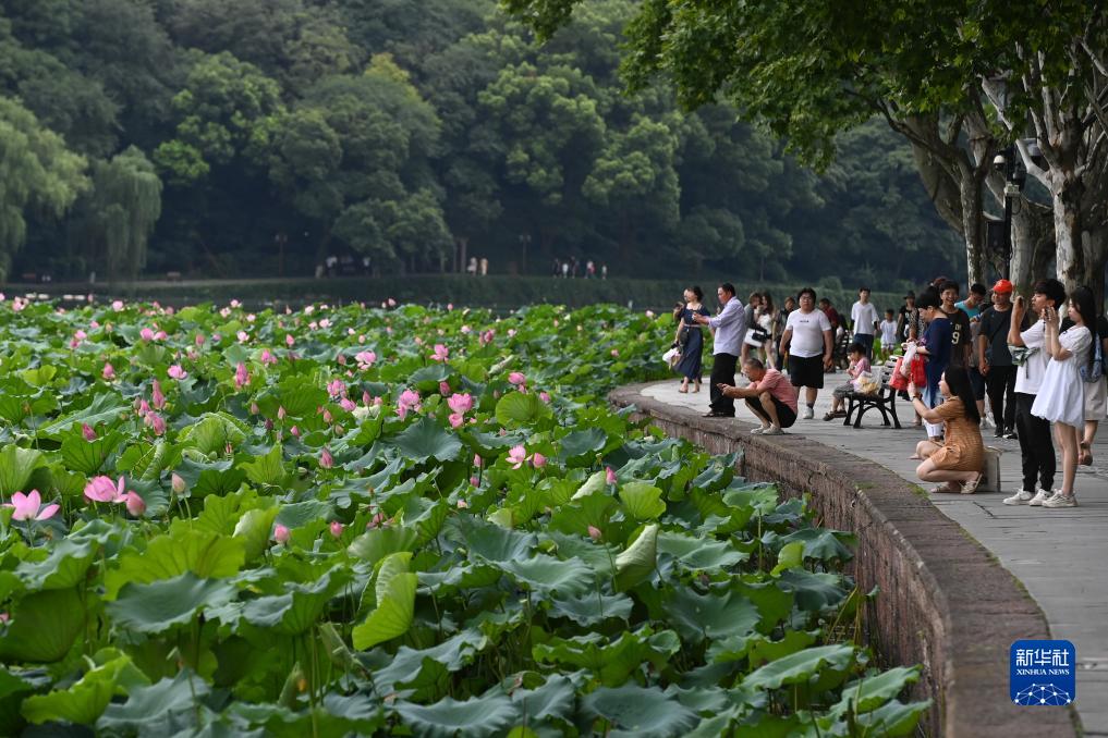 時值盛夏,杭州西湖景區荷花競相綻放,呈現出“接天蓮葉無窮碧,映日荷花別樣紅”的美麗景象。