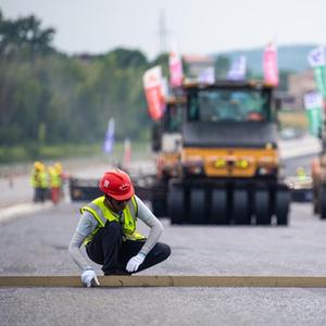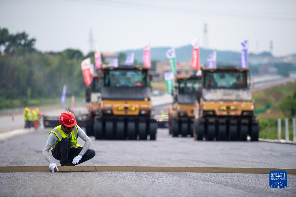 7月25日,在衡永高速路面工程施工現場,工人在檢測瀝青攤鋪平整度。