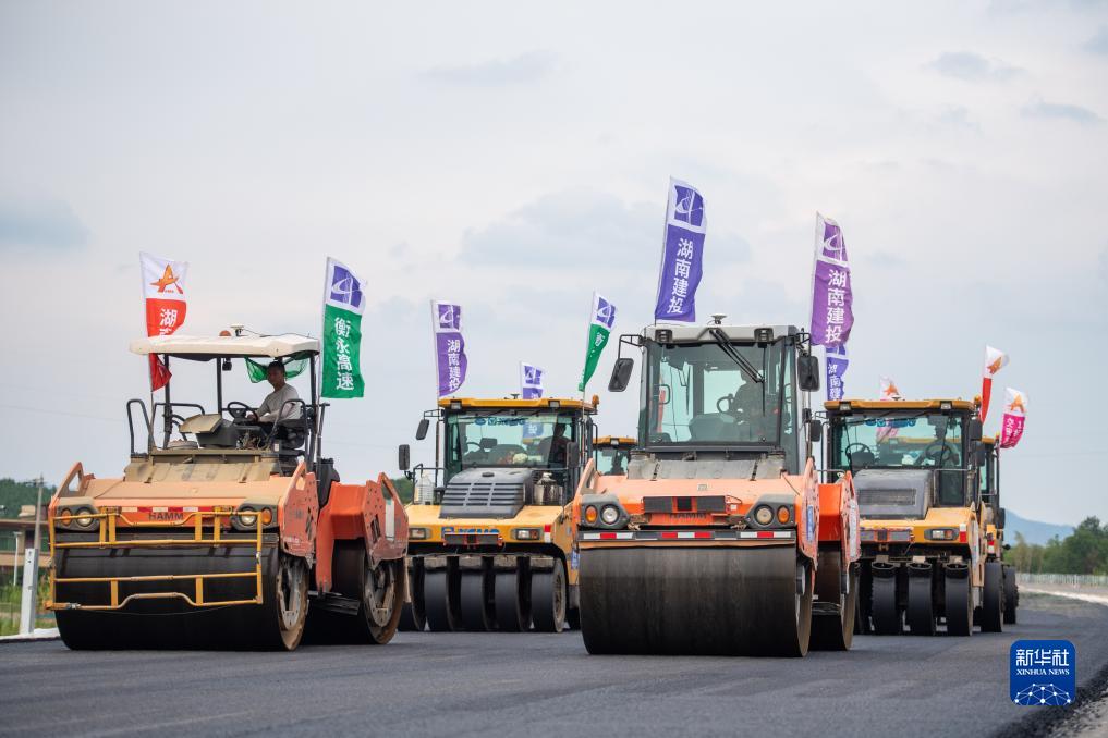 7月25日,壓路機在衡永高速路面工程施工作業。