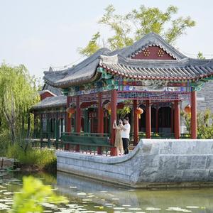 7月25日,游客在唐山花海景區內拍照。
