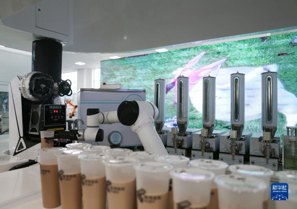 7月25日,在位于淄博市臨淄區的遨博(山東)智能機器人有限公司,機器人在制作奶茶。