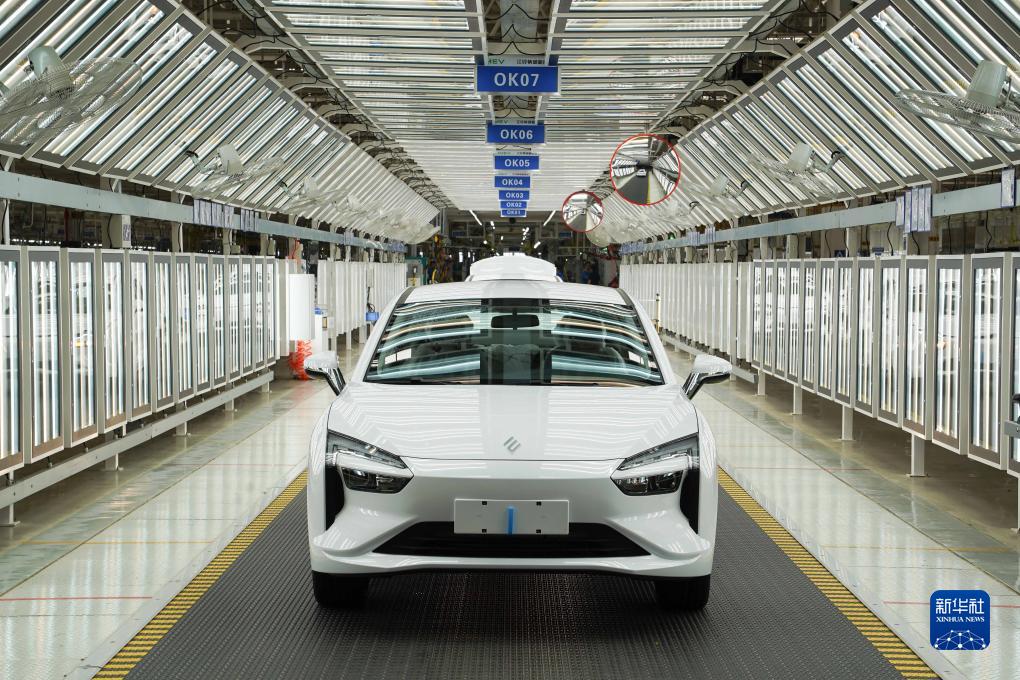 在位于江西省南昌市經開區的江鈴集團新能源汽車有限公司生產基地車間內,汽車在生產線上(7月18日攝)。新華社記者 周密 攝