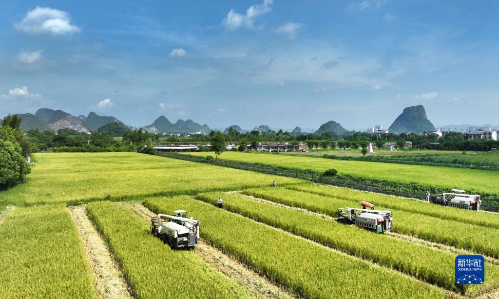 柳州市柳江區是廣西重要的糧食生產基地之一。連日來,柳江區種植的12.2萬畝早稻陸續進入成熟收獲期,當地農機部門組織收割機保障早稻收割的同時,還通過開展水稻機收減損技能比武等方式,引導廣大農民和農機手在生產實踐中精操作、比技能,保障夏糧豐收。新華社發(黎寒池 攝)