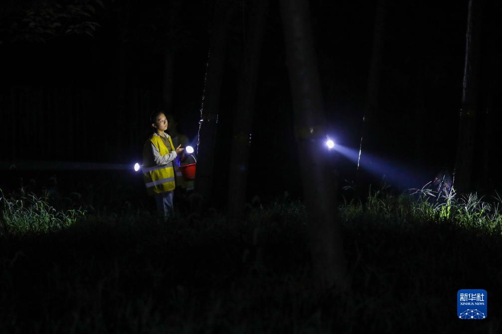 7月24日晚,在寶豐縣鬧店鎮連店村一處林下金蟬養殖基地,游客在體驗采收金蟬。新華社發(何五昌攝)
