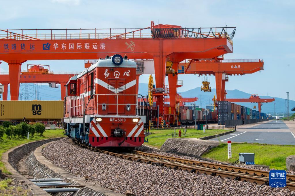 7月25日,在浙江省金華市華東國際聯運港,一輛“義新歐”中歐班列在海關監管下,裝載著110個標箱日用百貨、家用電器、家裝材料等貨物,啟程駛向哈薩克斯坦。