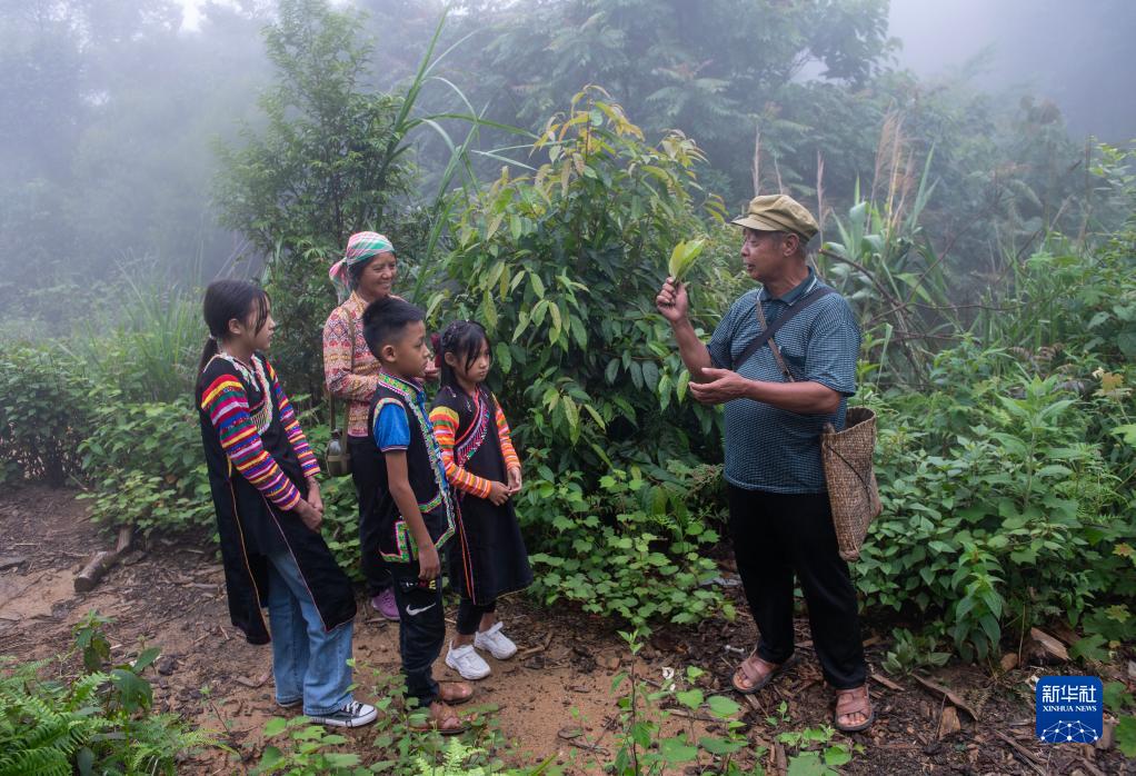 7月23日,張普忠(右一)在叢林中為孩子們介紹草藥。新華社記者 陳欣波 攝