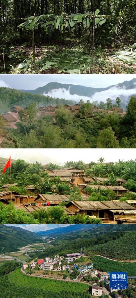 這張拼版照片展示了苦聰人住房的變化:上圖一為2023年7月23日張普忠老人根據自己記憶還原的當年苦聰人還處在原始社會時在森林里搭建的芭蕉葉棚子(新華社記者費茂華攝);上圖二為1984年金平縣頂青公社苦聰村寨里的茅草房(新華社記者閔福全攝);上圖三為2001年11月拍攝的金平縣者米鄉下納咪村苦聰山寨嶄新的石棉瓦房(新華社記者藺以光攝);下圖為2023年7月23日拍攝的金平縣者米鄉興發嶺村(新華社記者陳欣波攝)。新華社記者 費茂華 攝