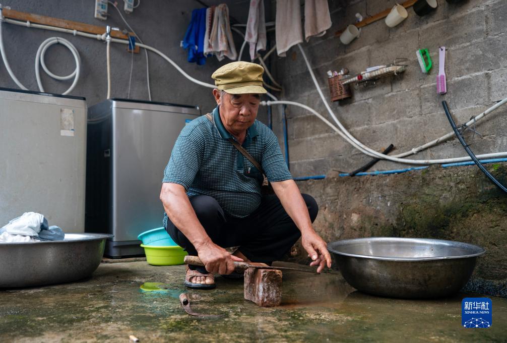 張普忠在家中院子里磨刀為上山做準備(7月23日攝)。新華社記者 陳欣波 攝