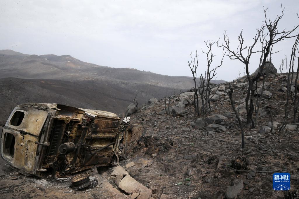 這是7月25日在阿爾及利亞貝賈亞省拍攝的被野火燒毀的車輛。