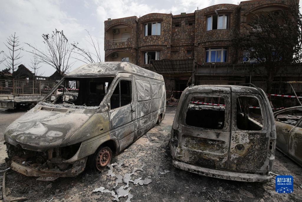 這是7月25日在阿爾及利亞貝賈亞省拍攝的被野火燒毀的房屋和車輛。