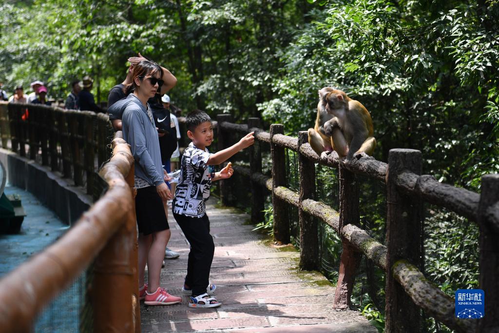 7月24日,在張家界國家森林公園十里畫廊景區,游客和獼猴互動。