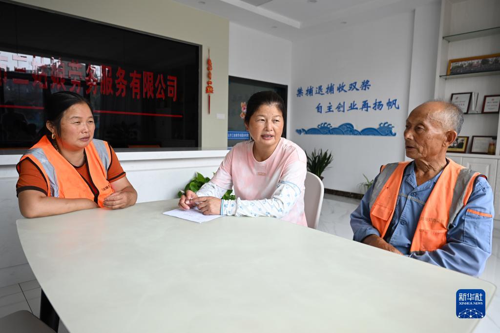7月24日,在馬鞍山市三姑娘勞務服務有限公司,陳蘭香(中)和工作人員交流。新華社記者 周牧 攝