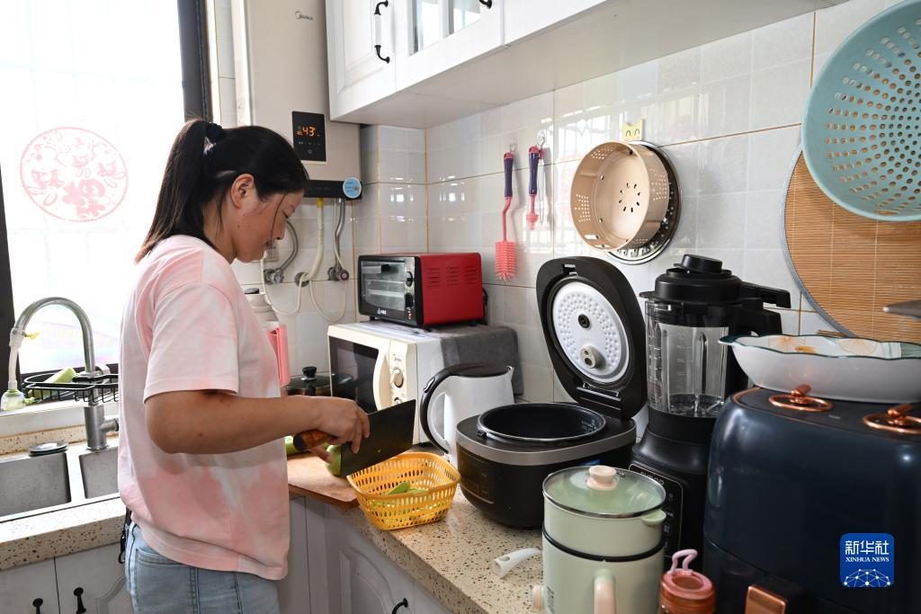 7月24日,陳蘭香在上岸后的新家里做飯。新華社記者 周牧 攝