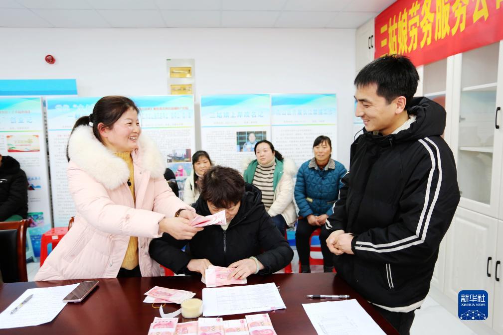 在馬鞍山市三姑娘勞務服務有限公司的股東分紅大會上,陳蘭香(左一)將錢分給員工(2022年1月29日攝)。新華社發(畢琛攝)
