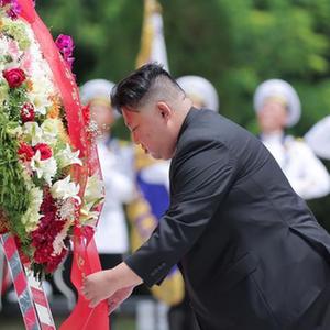 這張朝中社7月26日提供的照片顯示,朝鮮勞動黨總書記、國務委員長金正恩在朝鮮祖國解放戰爭勝利70周年之際,參謁位于平安南道檜倉郡的中國人民志愿軍烈士陵園。