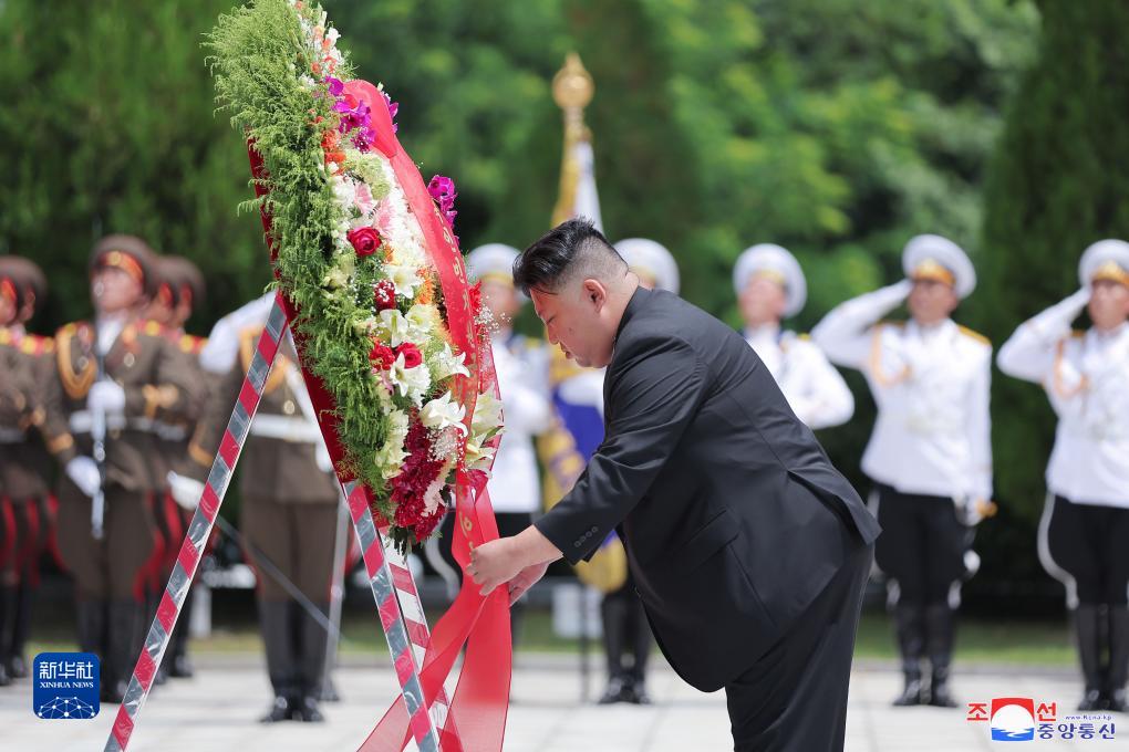 這張朝中社7月26日提供的照片顯示,朝鮮勞動黨總書記、國務委員長金正恩在朝鮮祖國解放戰爭勝利70周年之際,參謁位于平安南道檜倉郡的中國人民志愿軍烈士陵園。