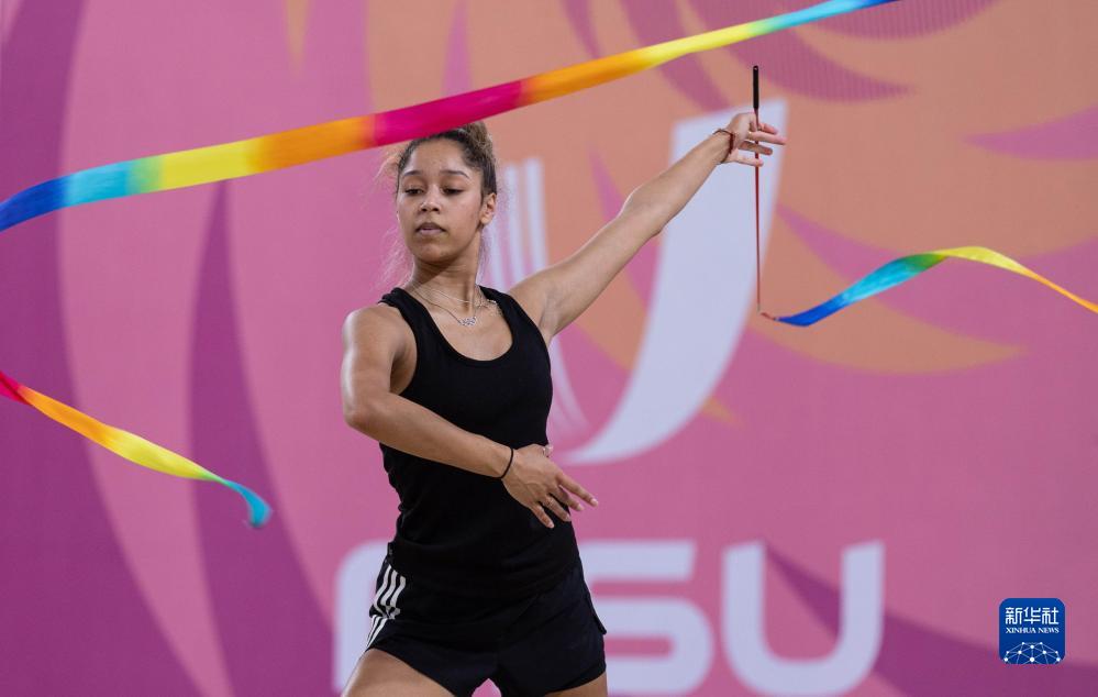 7月25日,南非大學生藝術體操隊的選手在成都體育學院體操館訓練。
