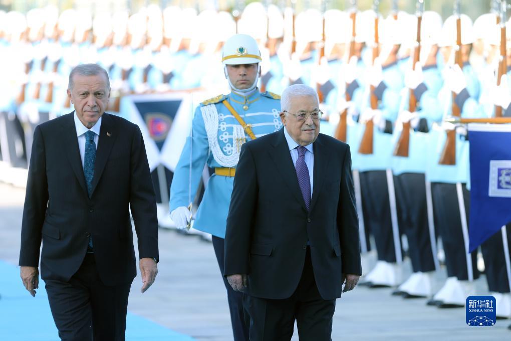7月25日,土耳其總統埃爾多安(左)在安卡拉歡迎到訪的巴勒斯坦國總統阿巴斯(右)。