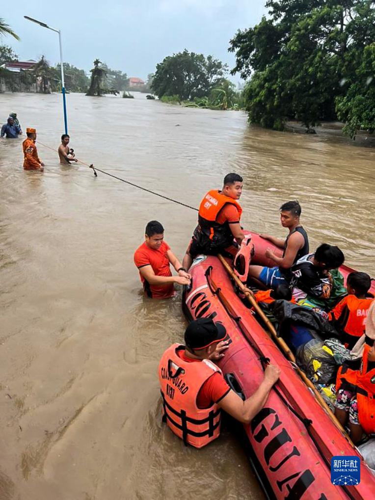 這張菲律賓海岸警衛隊發布的照片顯示,7月26日,救援人員在菲律賓呂宋島的北伊羅戈省冒著洪水撤離受災人員。