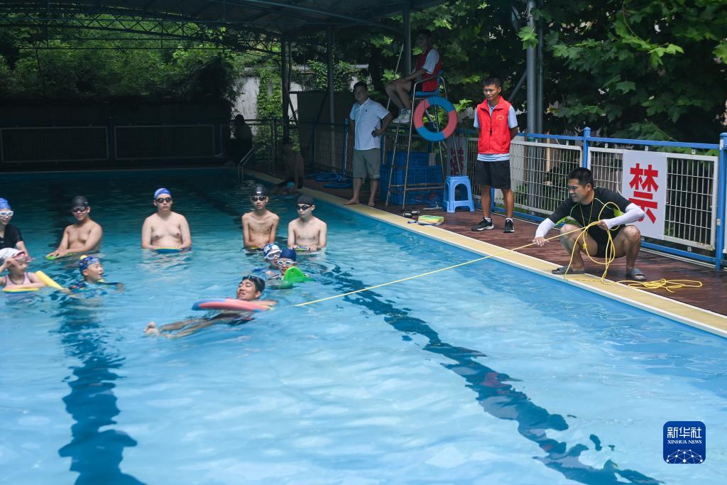 7月26日,國家中級游泳救生員、體育老師徐剛強(右一)在“蒲公英愛心習泳館”暑期愛心公益游泳班現場模擬溺水營救。