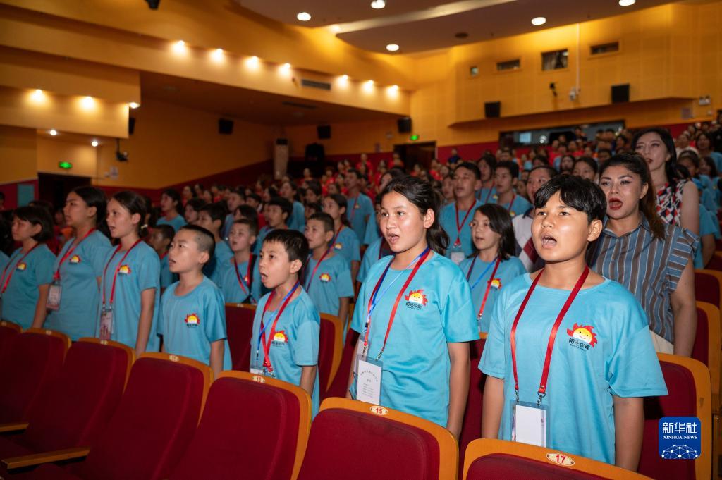 7月26日,在2023年陽光少年工會夏令營開營儀式上,營員們齊唱國歌。