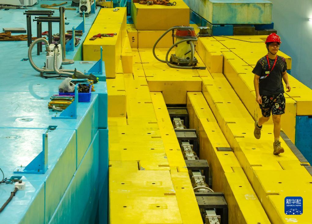 工程師在中國散裂中子源進行高分辨中子衍射儀設備安裝(7月18日攝)。
