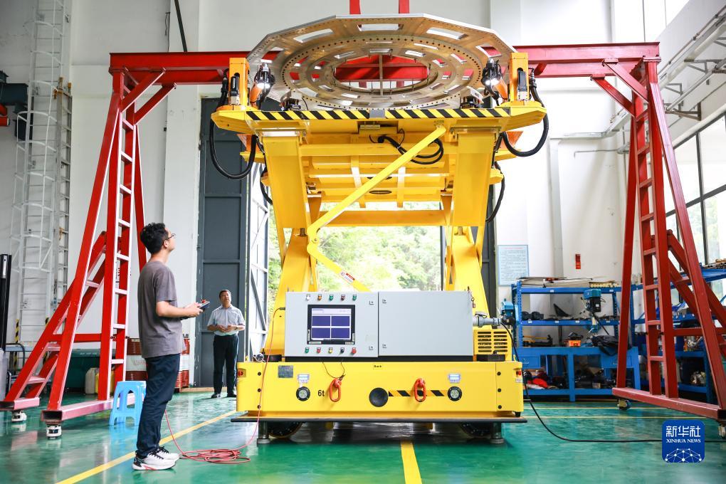 7月26日,工作人員在調試饋源接收機拆裝機器人。