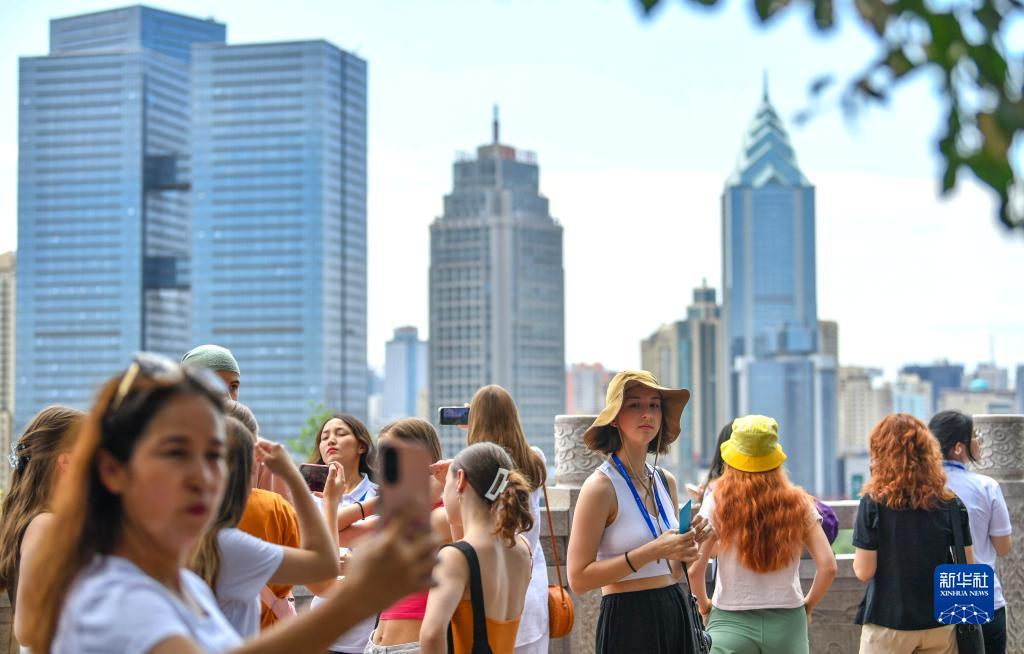 索菲婭和隊友們一起來到烏魯木齊紅山公園游玩(7月22日攝)。