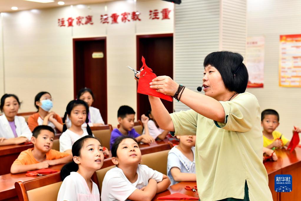7月26日,在莒縣城陽街道岳家村“小草學堂”,公益講師教孩子們剪紙。