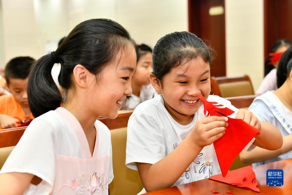7月26日,在莒縣城陽街道岳家村“小草學堂”,孩子們在學習剪紙。