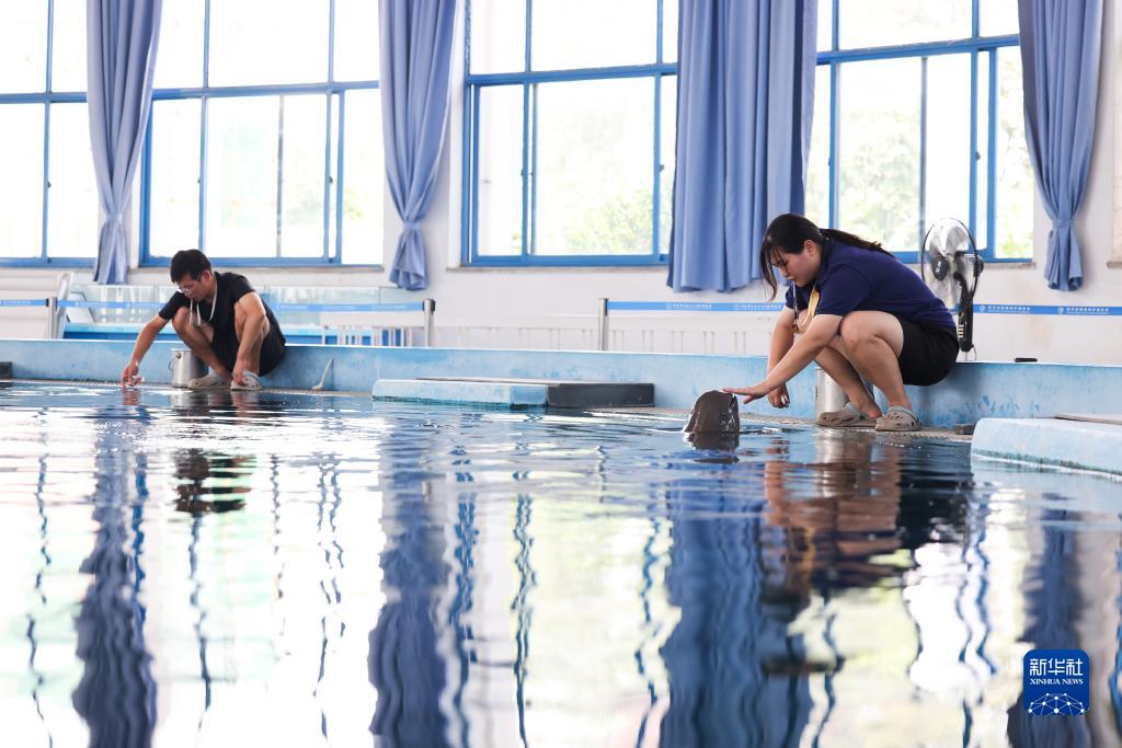 7月12日,中國科學院水生生物研究所白鱀豚館訓練員在給長江江豚喂食。