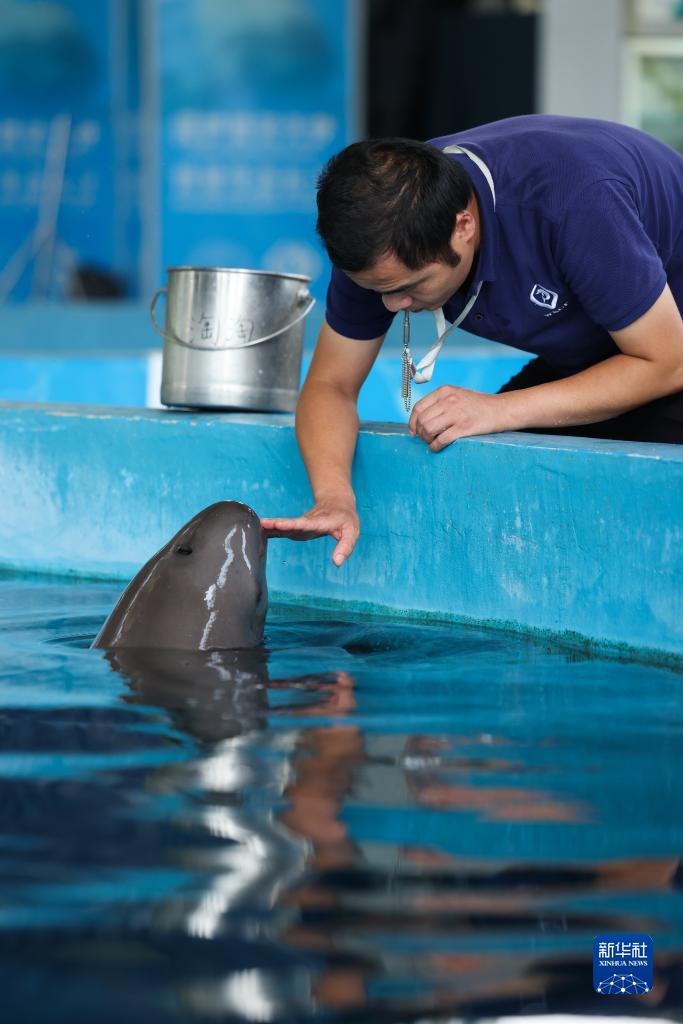 7月12日,中國科學院水生生物研究所白鱀豚館訓練員王超群在給長江江豚喂食。