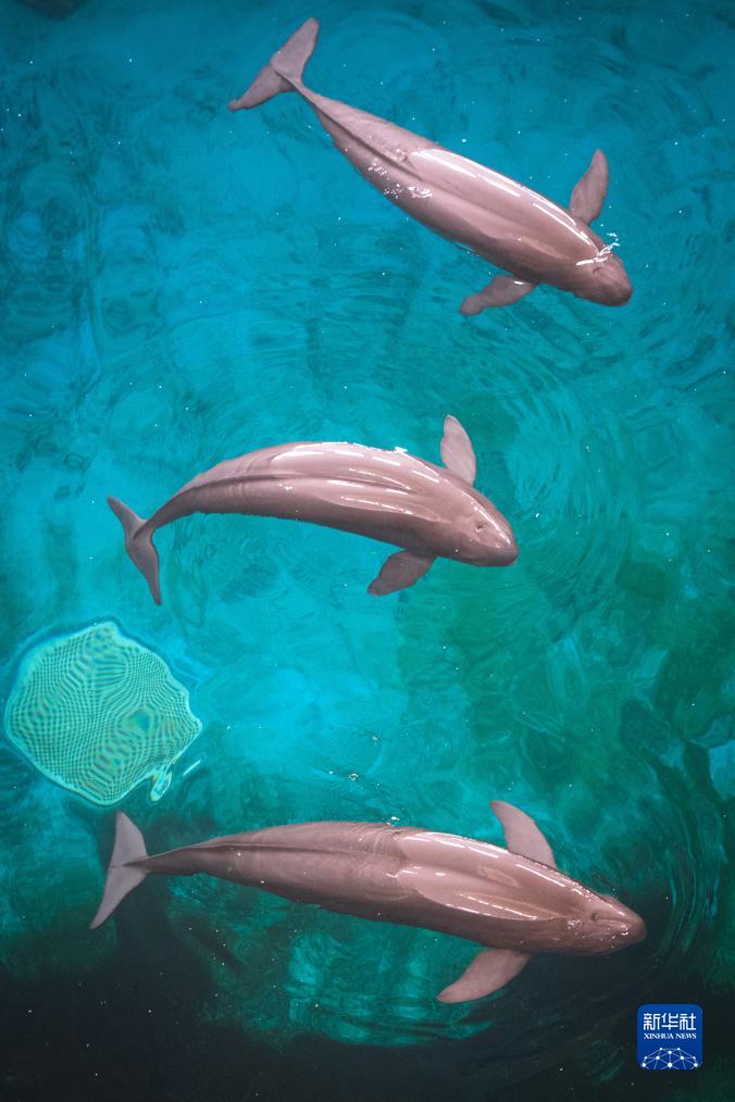 6月29日,三頭長江江豚在白鱀豚館水中游動。