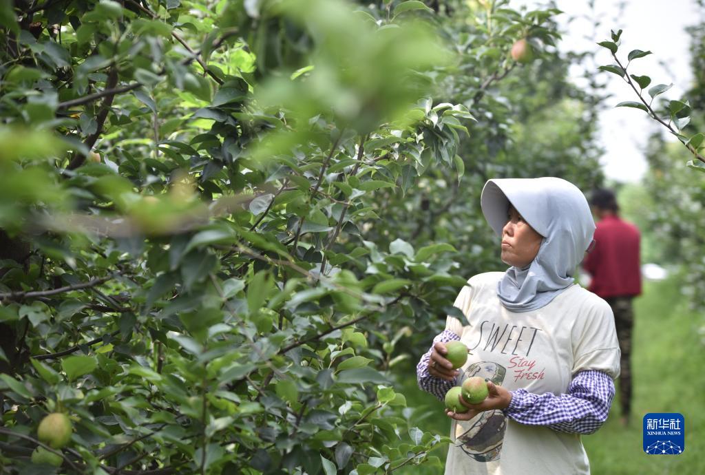 7月27日,河北省威縣張營鄉前花疃村果農在梨園采摘梨果。