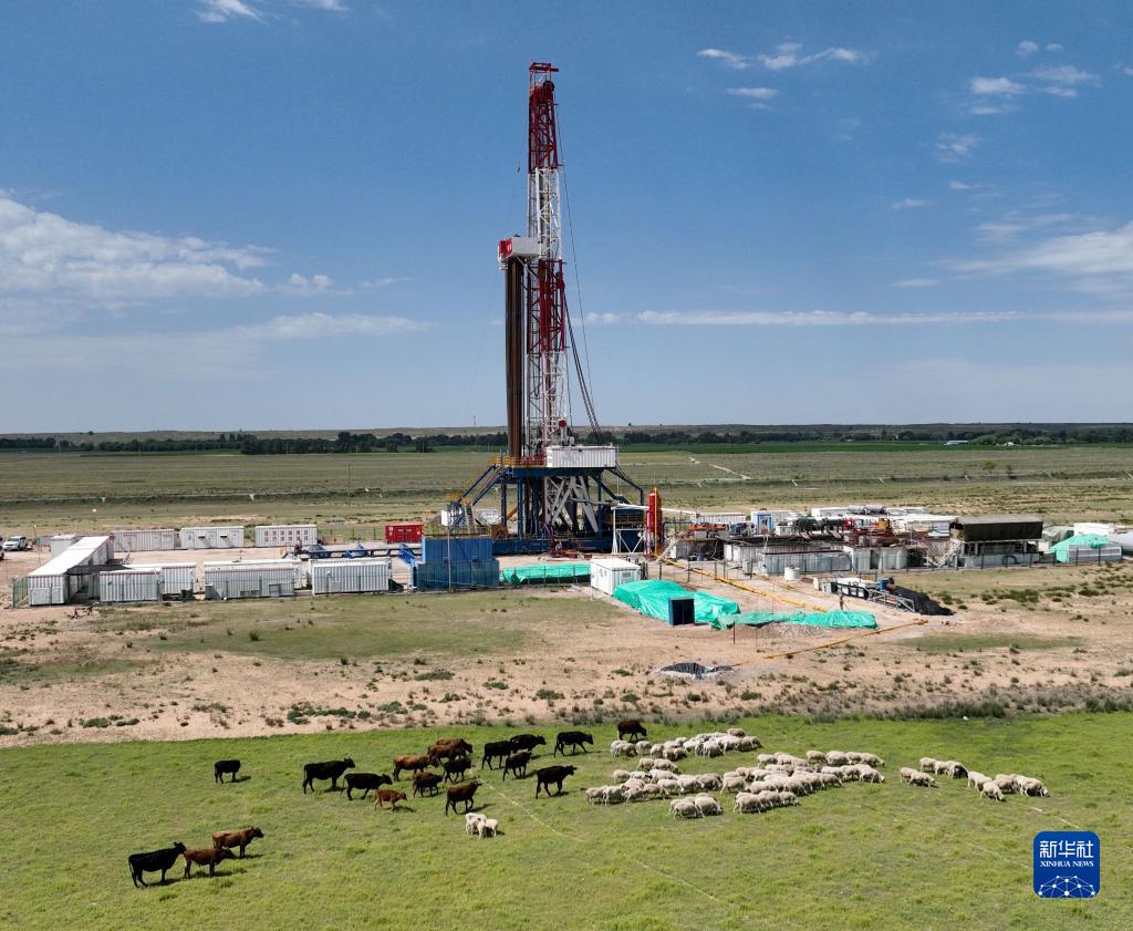 在長慶油田蘇里格氣田一處鉆井平臺旁,牛羊悠閑地吃著草(7月24日攝,無人機照片)。