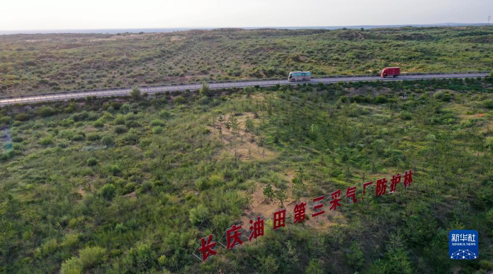 位于烏審旗的長慶油田第三采氣廠防護林(7月26日攝,無人機照片)。