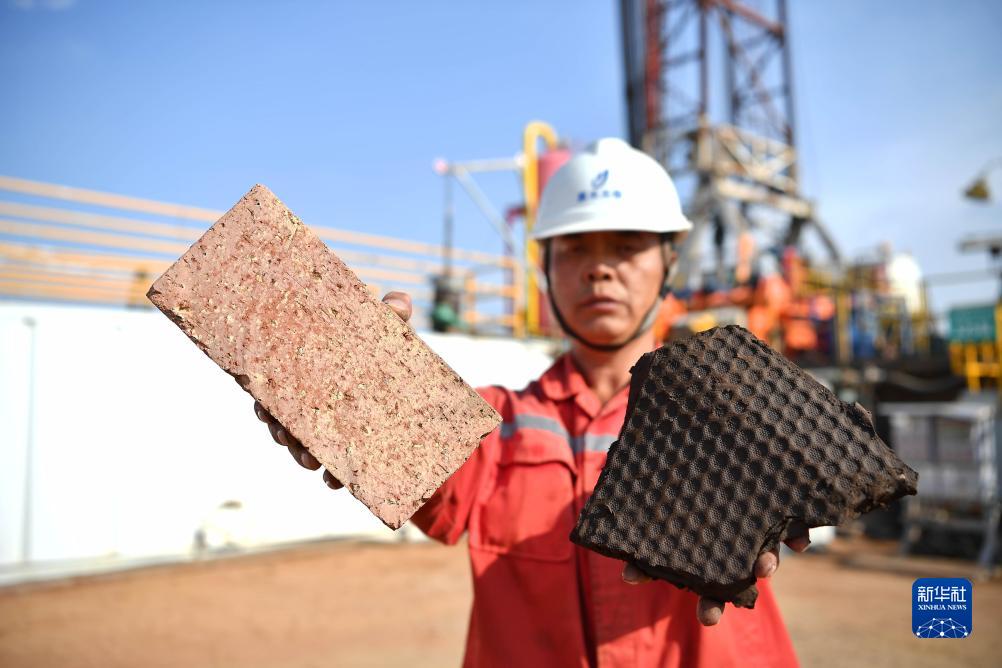 7月26日,在長慶油田蘇里格氣田一處鉆井平臺旁,技術人員在展示由鉆井巖屑制成的濾餅和“環保磚”。