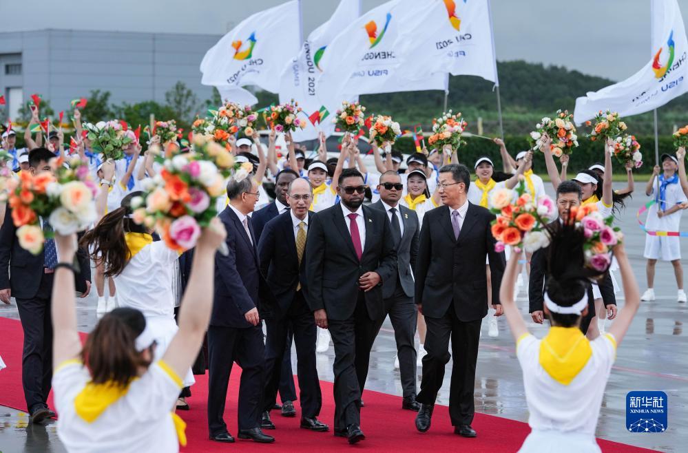 成都大運會丨來華出席成都大運會開幕式并訪問的圭亞那總統阿里抵達四川省成都市