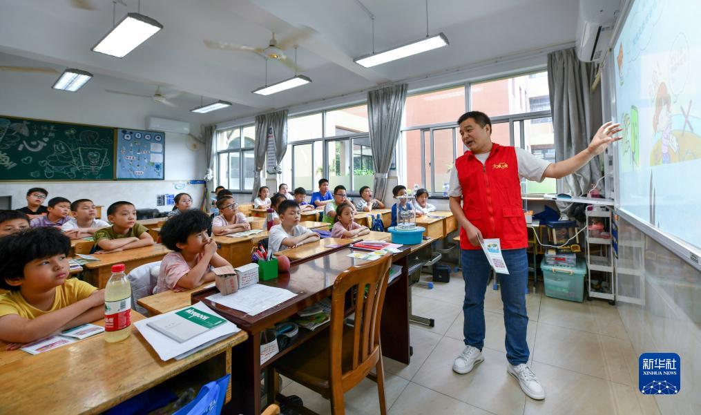 7月27日,在余姚市舜北小學暑托班內,志愿者在給孩子們上暑期電力安全課。