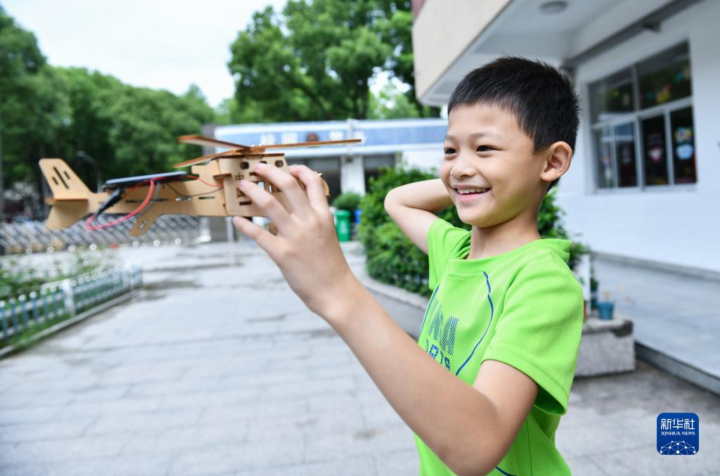 7月27日,余姚市舜北小學暑托班的孩子在展示自己的太陽能小作品。