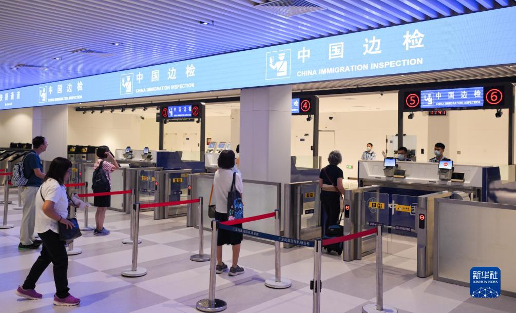 旅客在三亞鳳凰國際機場國際航站樓有序通關(7月26日攝)。