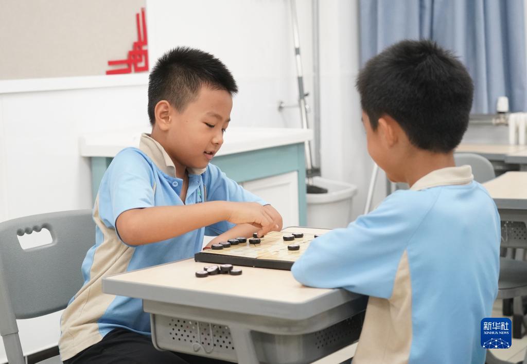 7月27日,在人大附中實驗小學,參加暑期托管班的學生在下象棋。