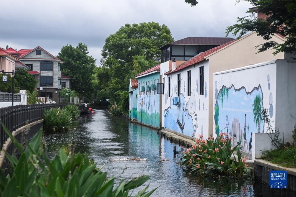 清澈的河道與精致的墻繪構成了嘉興市南湖區新豐鎮竹林村的美麗鄉村新畫卷(7月27日攝)。